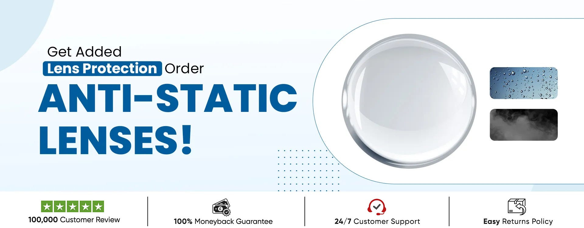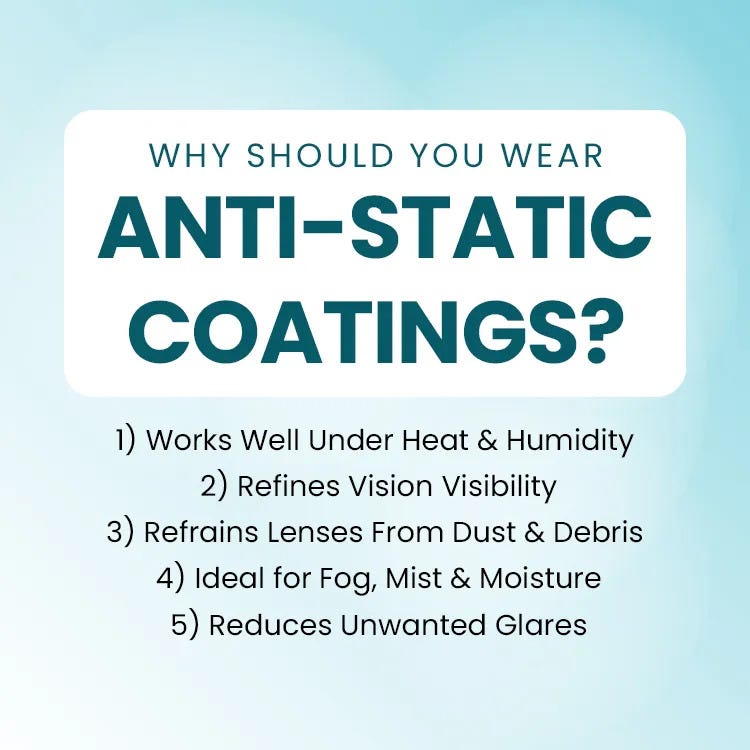 Safety: Fogged-up lenses can be a safety hazard, especially in situations where clear vision is crucial. Anti-static lenses help prevent accidents by ensuring that your vision is not compromised due to foggy eyewear.