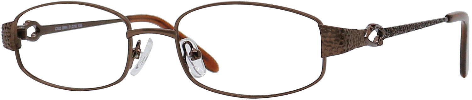 Christie Brinkley C305 are high-quality, alluring rectangle frames with a sleek and captivating full-rim design. These frames feature stylish rectangle lenses in a dainty front design that has an enticing nose bridge and is accompanied by stylized temples on the sides that have alluring details nicely carved on them with intriguing cutouts. The fascinating brown finish lends a nice touch of finesse to this chic look. These frames are made from lightweight metal. Add these glasses to your attire at the best prices, with the promise of a pleasant customer experience. These glasses will come packaged in a lovely Goggles4U case.