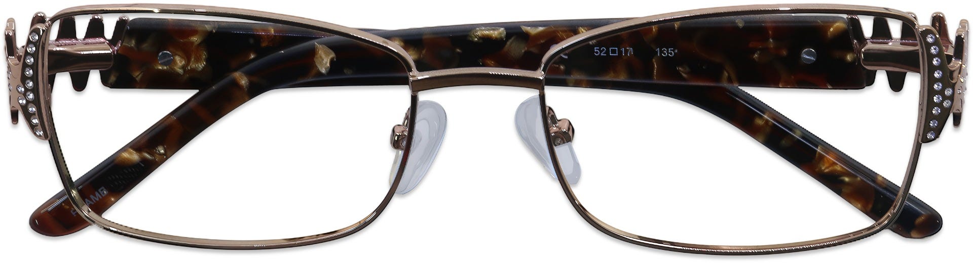 Rectangle Eyeglasses 185559 are premium alluring frames featuring an elegant full-rim design. The sophisticated rectangular lenses are beautifully complemented by the distinctive front and striking wide flat temples adorned with captivating rhinestones embedded in their decorative hinge accents. These frames showcase a chic gold-brown finish that enhances their eye-catching appeal. Crafted from a combination of lightweight metal and durable TR-90 material, they incorporate spring hinges for exceptional comfort and fit. Buy these glasses at the best prices with the promise of a great customer experience.